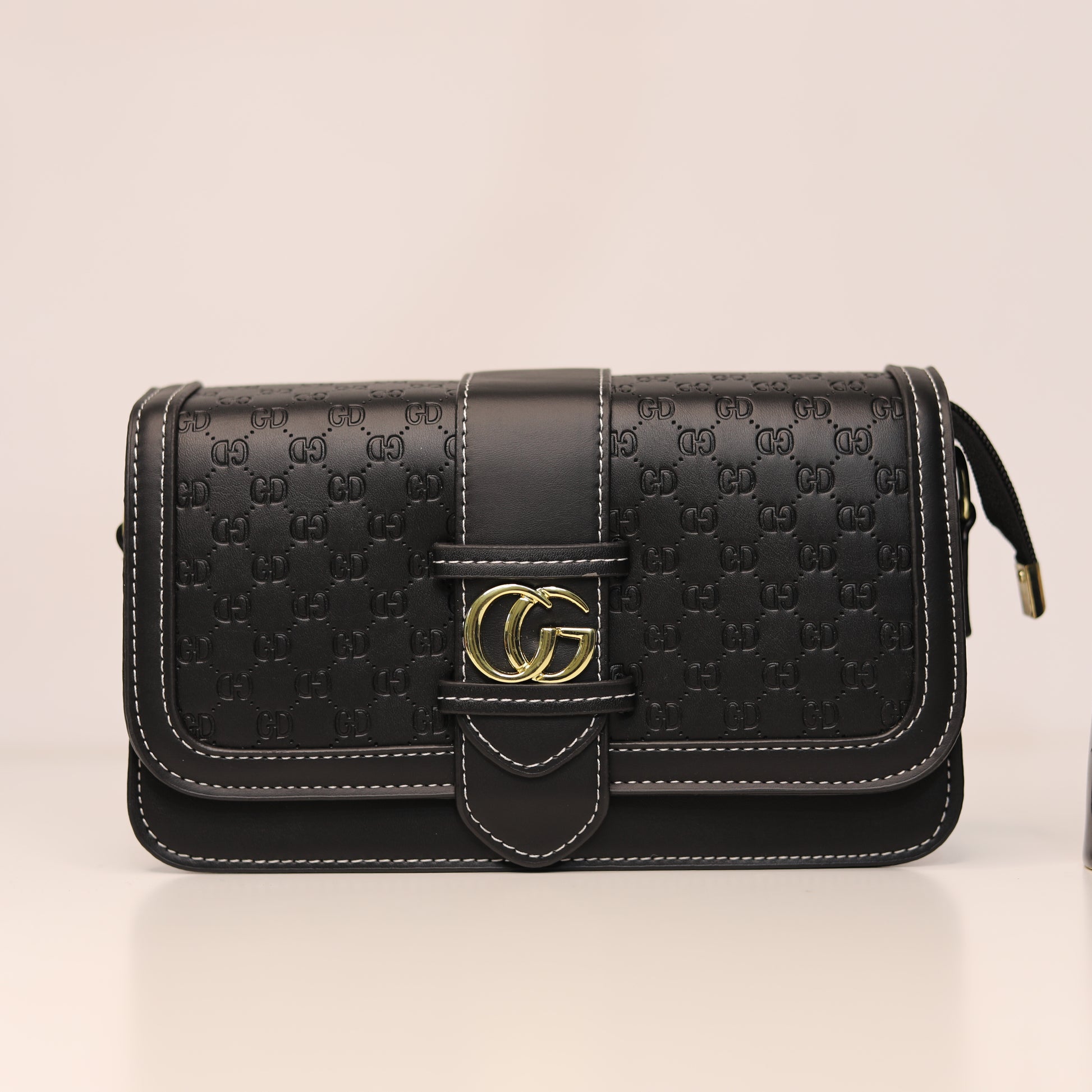 Upgrade your style with this premium black embossed mini bag, featuring a sleek structured silhouette, gold-tone GG emblem, and two interchangeable straps. Use it as a chic handbag, wallet-style clutch, or switch between the slim black strap for a refined look and the wide multicolor strap for a trendy crossbody vibe.