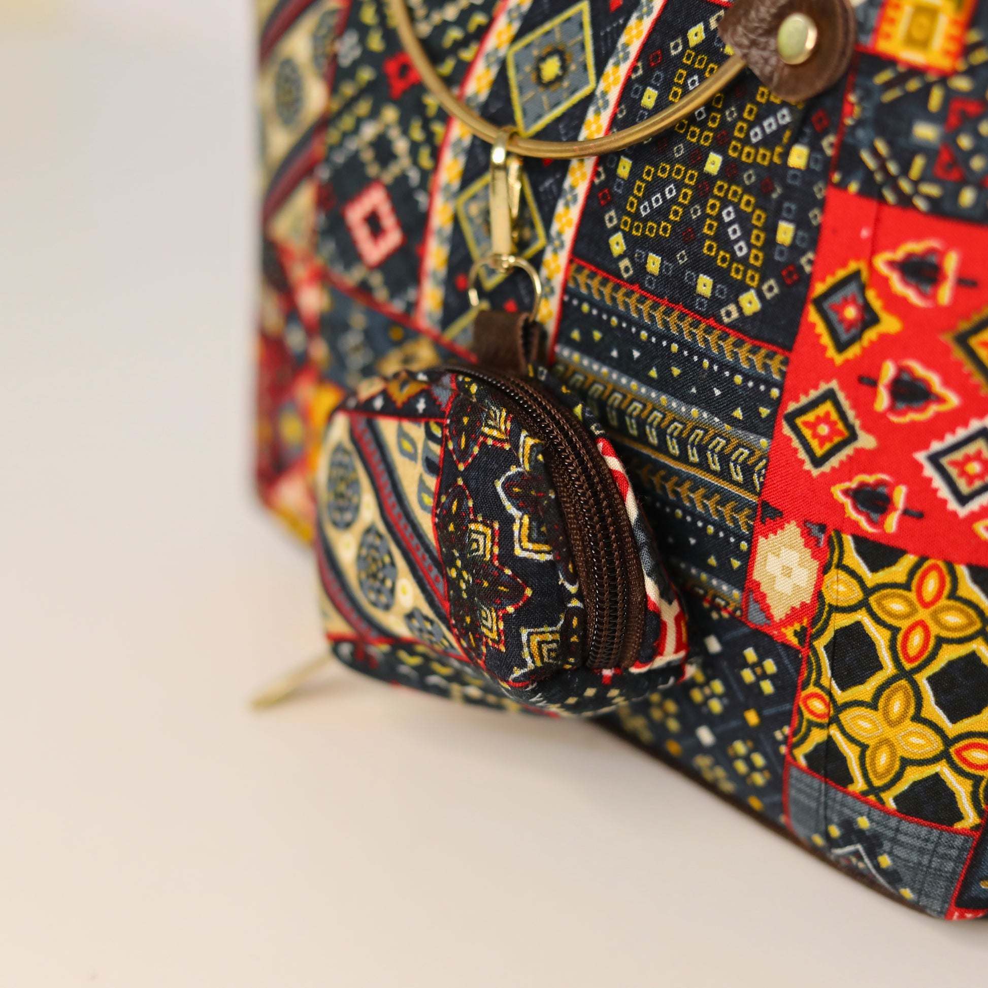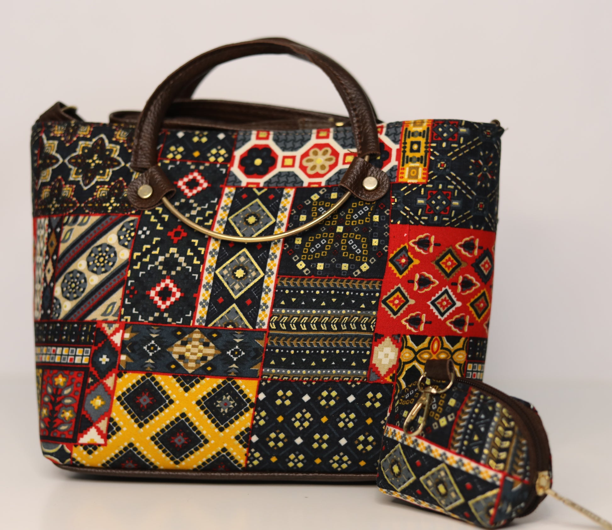 Ethnic Print Tote & Shoulder Bag Set โ Black & Multicolor Patchwork (2-in-1 with Mini Bag)